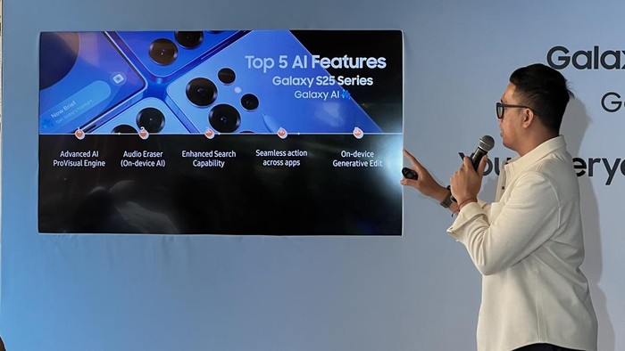 Ilham Indrawan, MX Product Marketing Manager Samsung Electronic Indonesia, mengungkapkan lima fitur AI unggulan Galaxy S25 series. Empat di antaranya merupakan fitur baru yang diluncurkan Januari lalu, sementara satu lagi telah hadir sejak seri Galaxy S24.
