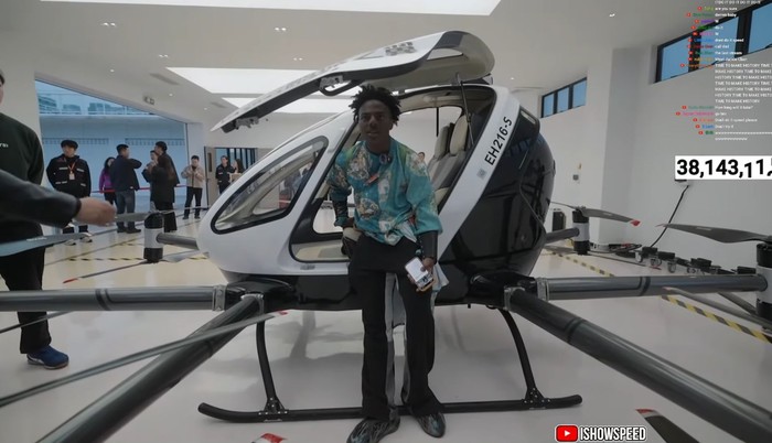 iShowSpeed, selama kunjungannya ke China, mendapat kesempatan mencoba mobil terbang EHang EH-216S. Ia bahkan ditawari untuk membelinya.