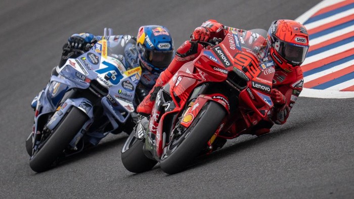 Berikut hasil lengkap MotoGP Argentina 2025: 1. Marc Marquez (Ducati Lenovo Team); 2. Alex Marquez (Gresini Racing MotoGP); 3. Franco Morbidelli (Pertamina Enduro VR46 Racing Team); 4. Francesco Bagnaia (Ducati Lenovo Team); 5. Fabio Di Giannantonio (Pertamina Enduro VR46 Racing Team); 6. Johann Zarco (LCR Honda); 7. Brad Binder (Red Bull KTM Factory Racing); 8. Ai Ogura (Trackhouse MotoGP Team); 9. Pedro Acosta (Red Bull KTM Factory Racing); 10. Joan Mir (Honda HRC Castrol); 11. Luca Marini (Honda HRC Castrol); 12. Alex Rins (Monster Energy Yamaha MotoGP); 13. Maverick Vinales (Red Bull KTM Tech3); 14. Jack Miller (Prima Pramac Yamaha); 15. Fabio Quartararo (Monster Energy Yamaha MotoGP); 16. Raul Fernandez (Trackhouse MotoGP Team); 17. Fermin Aldeguer (Gresini Racing MotoGP); 18. Enea Bastianini (Red Bull KTM Tech3); 19. Somkiat Chantra (LCR Honda).
