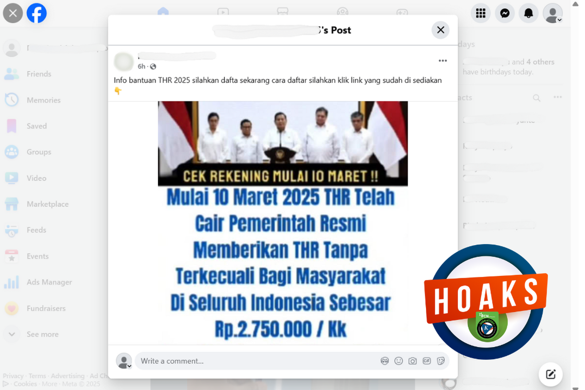 Baru-baru ini, beredar informasi hoaks di media sosial tentang pemberian THR dari pemerintah sebesar Rp 2,75 juta per keluarga. Informasi ini tersebar luas sejak pertengahan Maret 2025, dan menyertakan tautan yang mengarahkan ke situs palsu.
